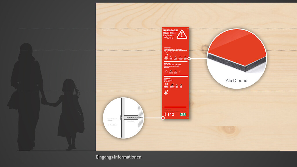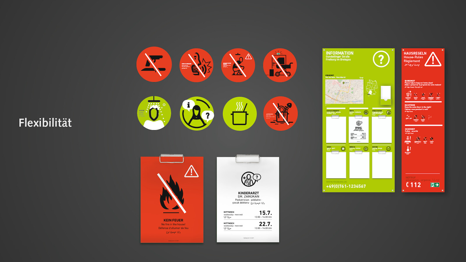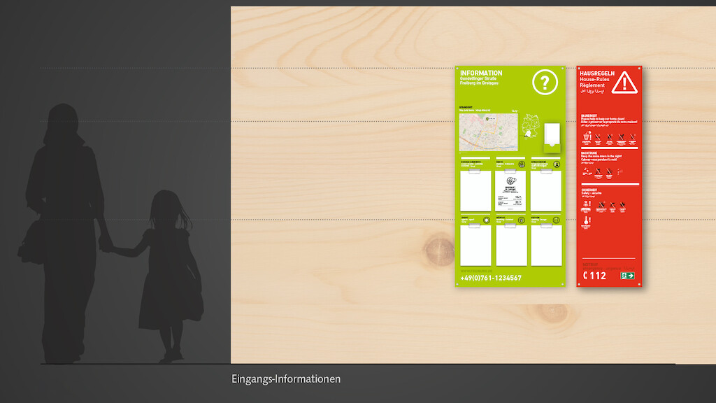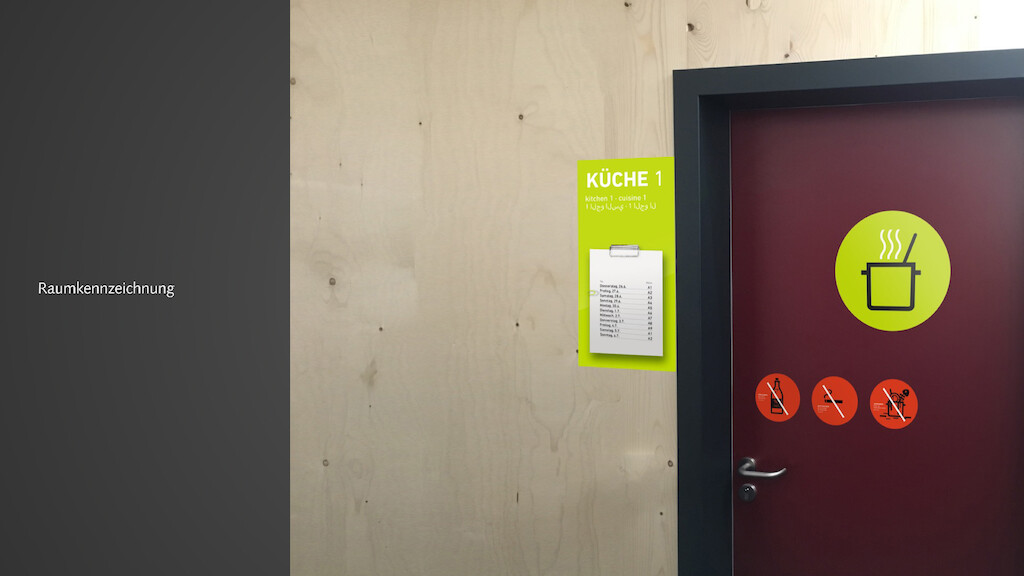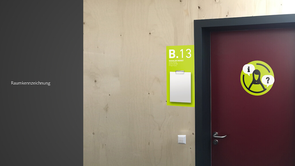 Am Beispiel der temporären Flüchtlingsunterkünfte der Stadt Freiburg hat designconcepts ein flexibles und niedrigschwelliges grafisches Orientierungskonzept entwickelt. Basierend auf einer einfachen piktografischen Sprache und klaren Farbcodes wird so eine erste Orientierung und Wegeleitung möglich gemacht, werden Regeln kommuniziert und generell das Zusammenleben in dieser temporären Extremsituation erleichtert. Durchdachte Signaletik kann zwar allein nicht alle Probleme auf einen Schlag lösen, wohl aber die Aufenthalts- und Lebensqualität für Bewohner und Mitarbeiter signifikant steigern und so Frustrationsquellen minimieren.