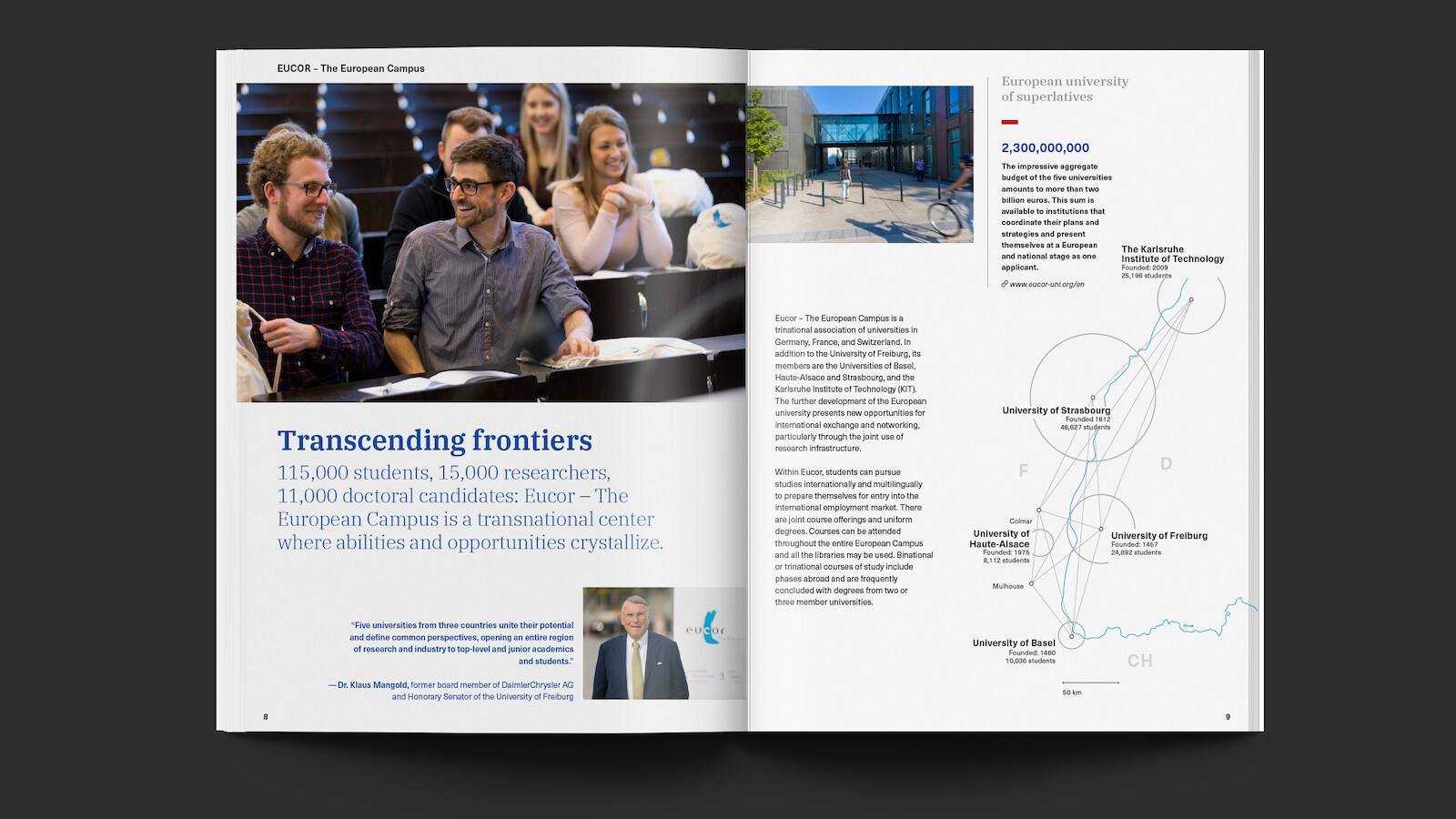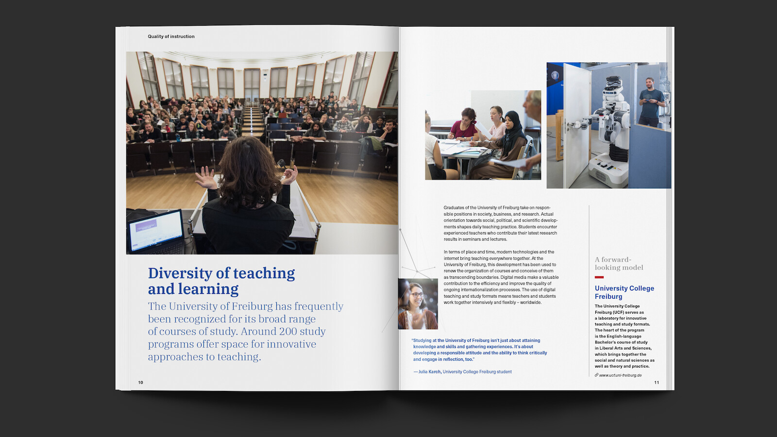 Aber die Universität im 21. Jahrhundert ruht sich nicht auf ihren Meriten und dem Charme der traditionsreichen Studentenstadt Freiburg aus, sondern begibt sich aktiv in den Austausch über Universitäts- und Landesgrenzen hinweg. Innerhalb des Wissenschafts- und Wirtschaftsraums Oberrhein entwickelt sich so ein Magnet für die hellen Köpfe aus aller Welt und aus allen Fachgebieten. Um dieses neue Selbstverständnis wertig und zeitgemäß darstellen zu können, haben wir für die Universität unter dem Motto "Connecting Creative Minds" ein Imagemagazin entwickelt. Klar, authentisch und die Menschen im Wissenschafts-Großbetrieb zu Wort kommen lassend.