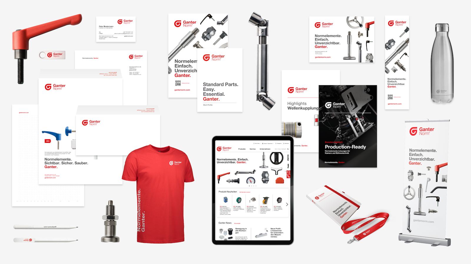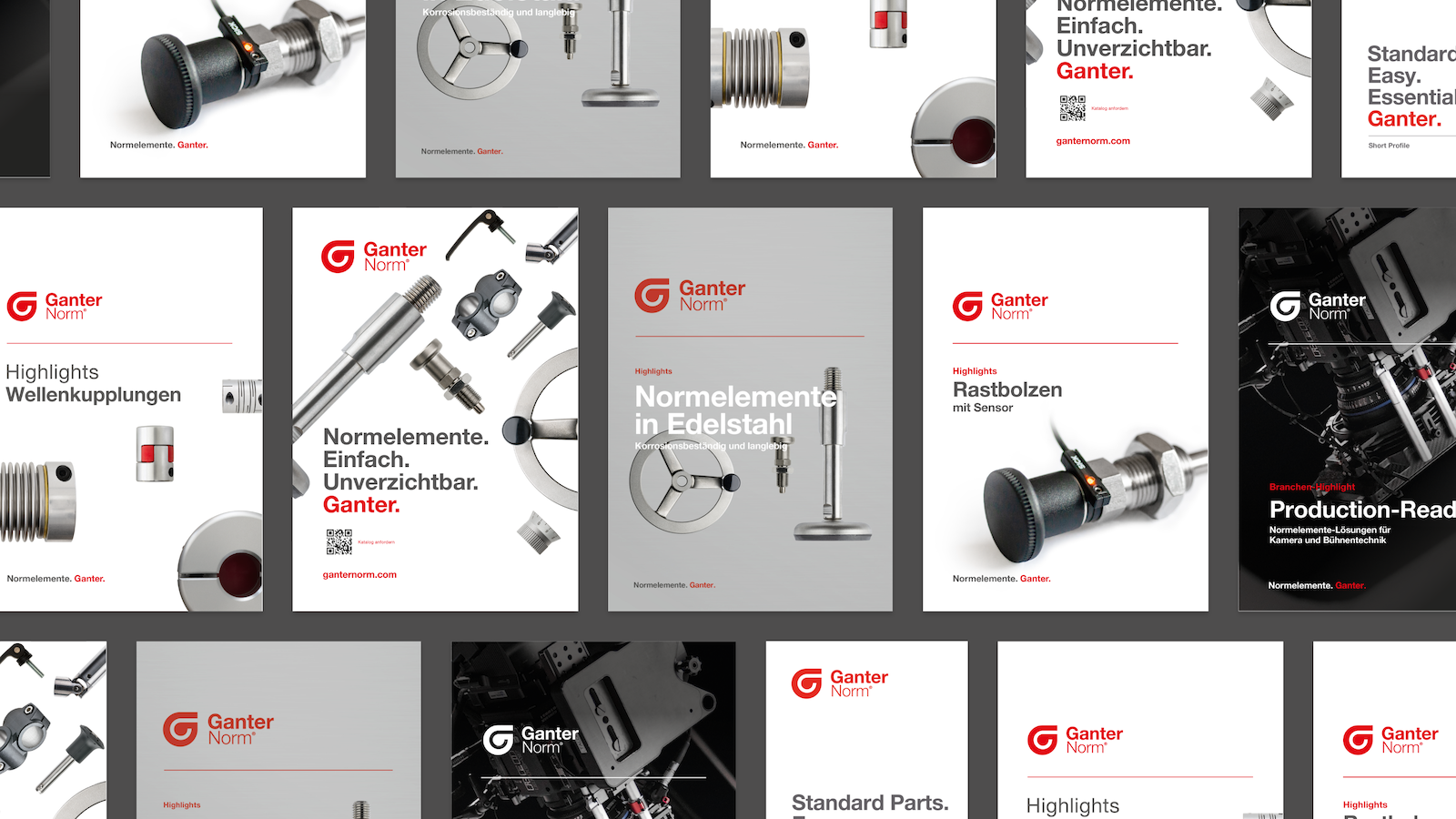 Das Corporate Design von Ganter basiert auf den Prinzipien der Ingenieurskunst: präzise Typografie, reduzierte Farbwelten und ein konsistentes Layoutsystem. Damit spiegelt des CD die Werte des Unternehmens wider: Funktionalität, Einfachheit und Ingenieurskunst. Diese Gestaltung macht die enorme Produktvielfalt von über 70.000 Teilen übersichtlich erfahrbar und schafft zugleich eine unverwechselbare Markenpräsenz, die international wiedererkennbar ist.
