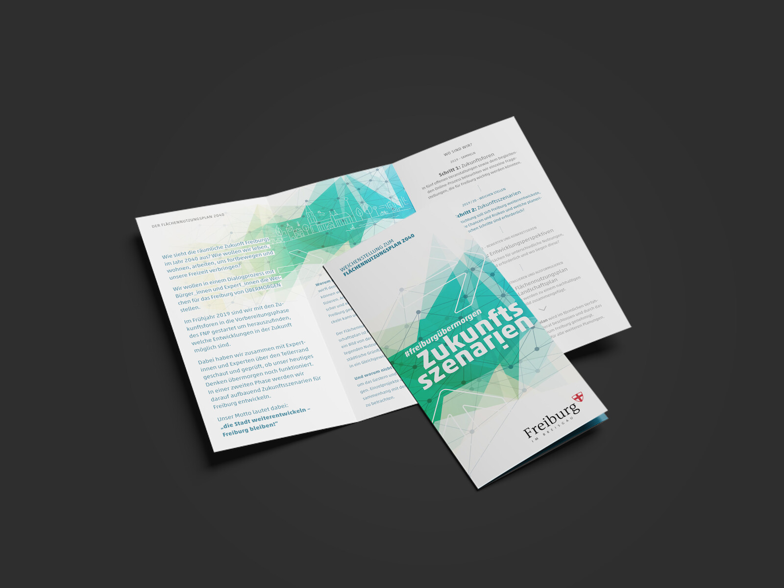 Wir begleiten die Stadtplanungsexperten auf visueller und kommunikativer Ebene und geben so den teils abstrakten Planungsschritten ein Gesicht. Nach den erfolgreich abgeschlossenen Zukunftsforen steht mit der Entwicklung konkreterer ›Zukunftsszenarien‹ im Jahr 2020 ein weiterer Meilenstein ins Haus. Hier wird das Thema Zukunft greifbarer: Eine Handvoll Szenarien, also mögliche „Zukünfte“ für die Stadt, werden formuliert und auf ihre Realisierbarkeit hin überprüft und detailliert. Im gleichen Zug, wie die Planungen damit ein Stück konkreter werden, entwickelt sich auch die grafische Sprache weiter. Aus Farbflächen werden Formen, aus der monochromen Farbwelt wird ein Spektrum. Lineare Grafiken und Icons sind vielseitig einsetzbar.